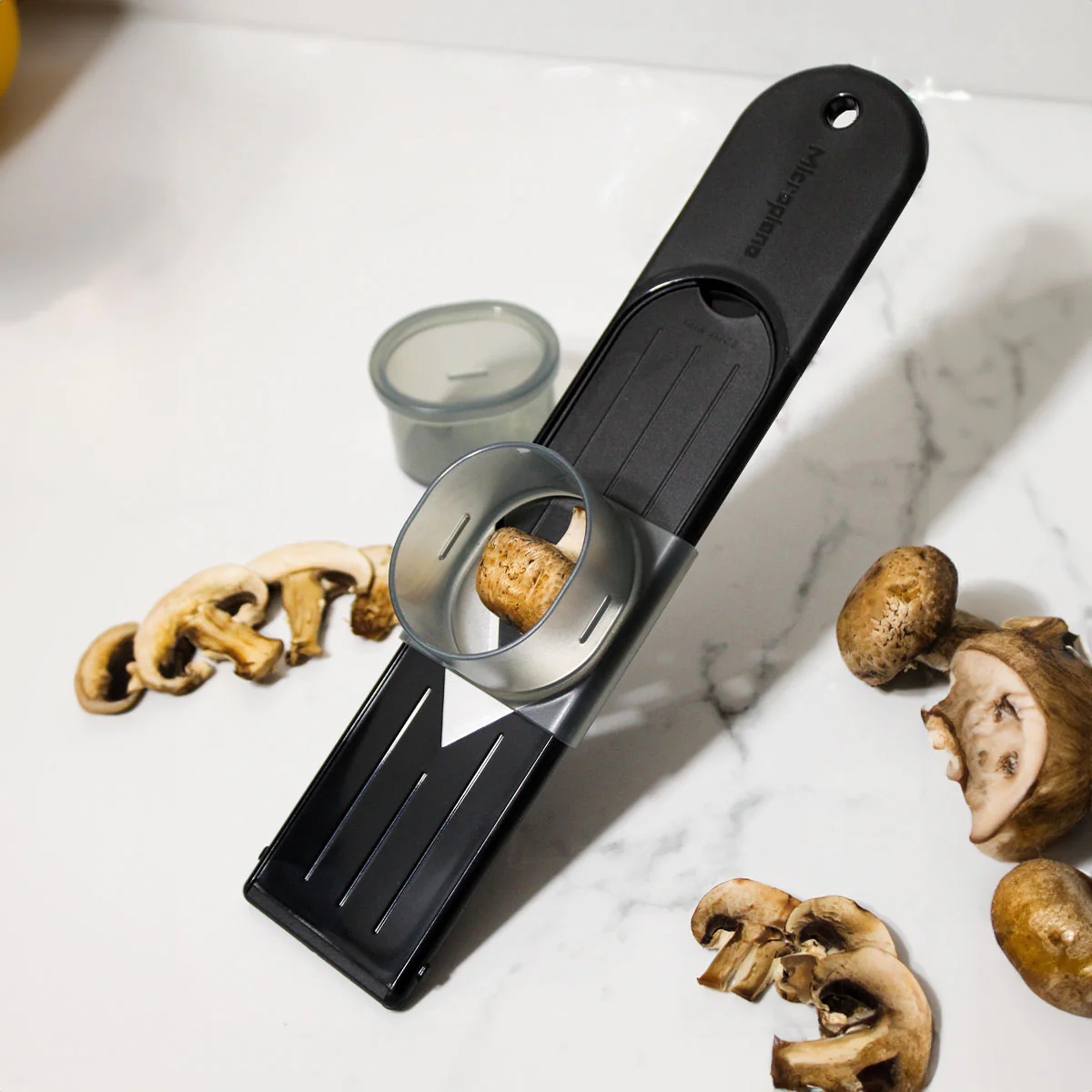 Microplane's Mini Mandoline is the ideal kitchen tool for slicing delicate foods such as mushrooms, strawberries, and eggs. Expertly crafted from premium stainless steel, our Mini Mandoline guarantees consistent and precise cuts every time. With three adjustable thickness settings, you can always achieve the perfect slice for your dish. The slider attachment safeguards your fingers, ensuring a safe and effortless slicing experience, even with the most fragile foods. Its compact and lightweight design makes it a convenient addition to small kitchens or for cooking on the go. Additional features include a reusable blade cover for secure storage, a soft-touch handle and non-slip foot for stability, and a reversible deck that can effortlessly switch from thin to medium slices or be removed entirely for extra thick slices.