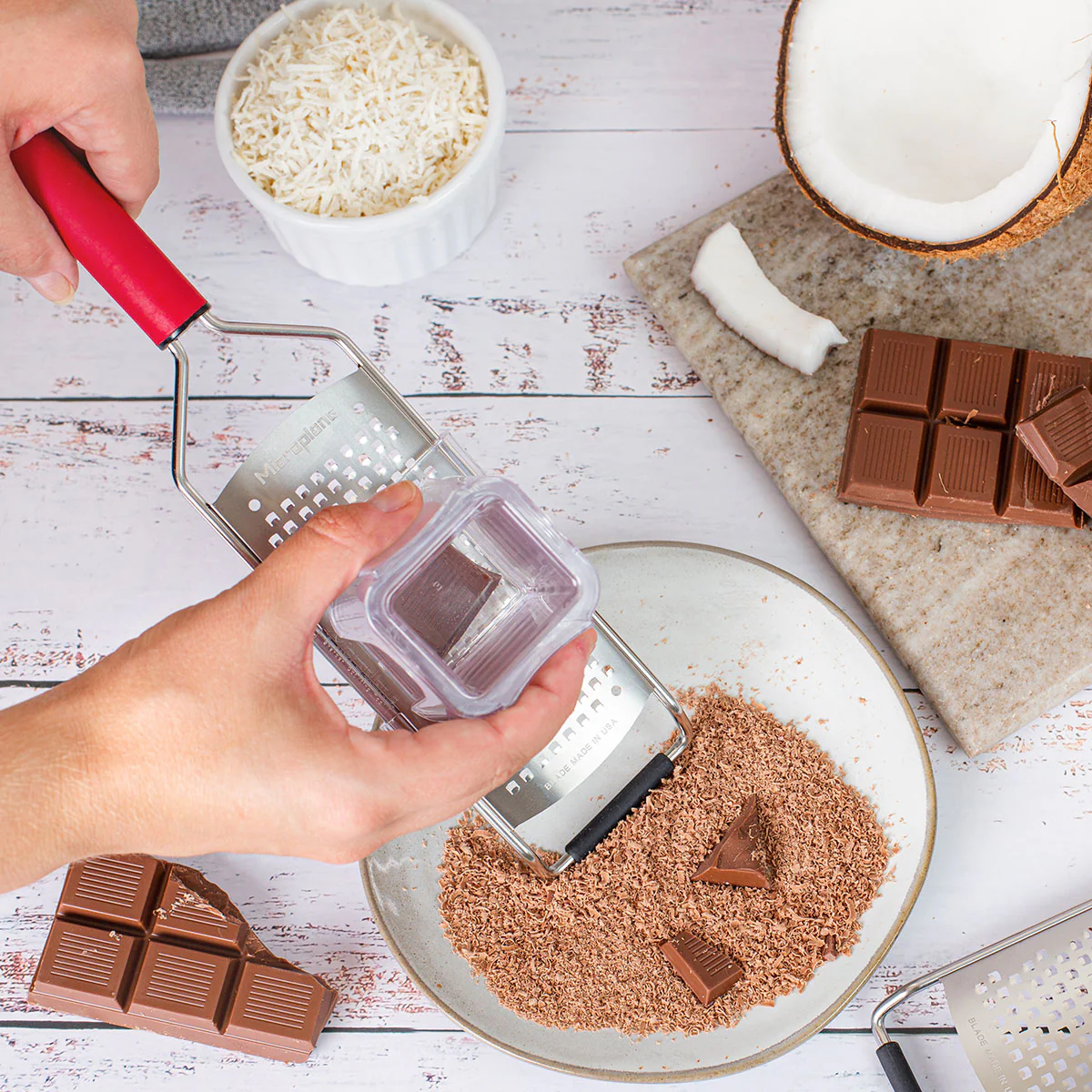- Unmatched Sharpness: Experience the enduring sharpness of the etched stainless steel blade, made in the USA, perfect for grating a variety of foods such as semi-soft cheeses, vegetables and fruits swiftly and efficiently.
